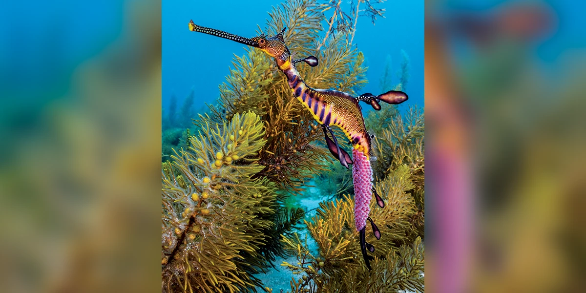 El dragón de mar común (Phyllopteryx taeniolatus) no tiene nada de común. Endémico de las aguas costeras templadas de Australia, este espectacular pariente del caballito de mar —también conocido como dragón de mar foliado— puede alcanzar hasta 45 centímetros de longitud y está adornado con bellos colores y extravagantes apéndices dérmicos en forma de lágrima.