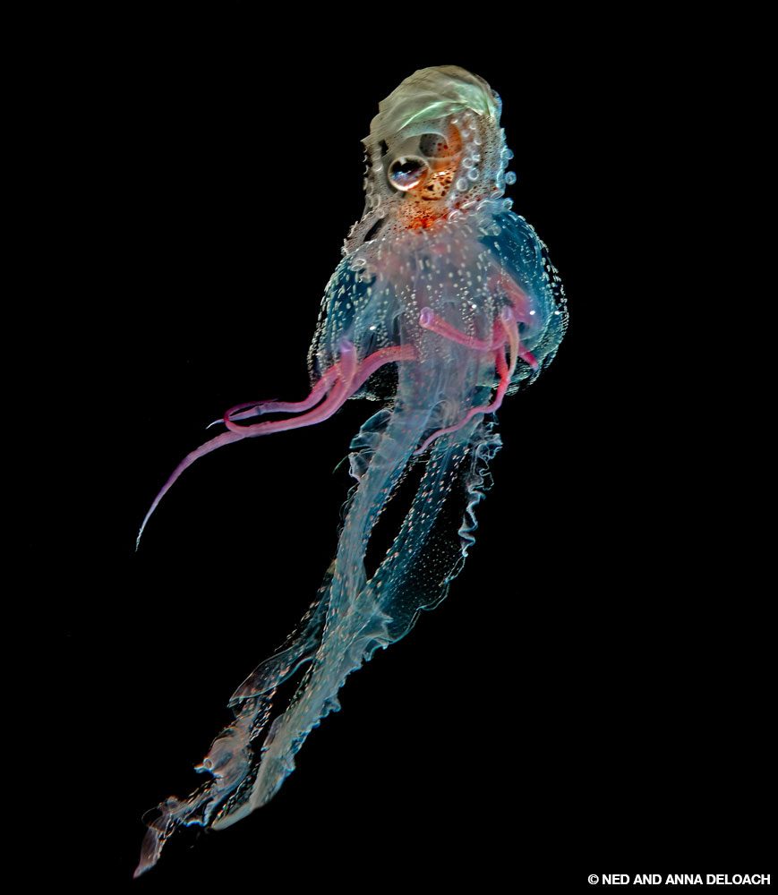 La oportunidad de desplazarnos a la deriva en las aguas costeras de Lembeh en la oscuridad de la noche mientras la gente que estaba en el centro turístico bebía un segundo cóctel tuvo un papel importante en la razón por la que regresamos al estrecho en esta oportunidad. Íbamos en busca de la diminuta larva pelágica de los peces e invertebrados adultos que hemos documentado por años. Y sucedió exactamente lo que esperábamos: otra bonanza de Lembeh con pámpanos poslarvales arremolinándose, crías de peces pipa con forma de dragón, peces cocodrilo de 15 mm (media pulgada), un pulpo de largos brazos que atravesaba nuestras luces y un argonauta viajando sobre una medusa no tan feliz.