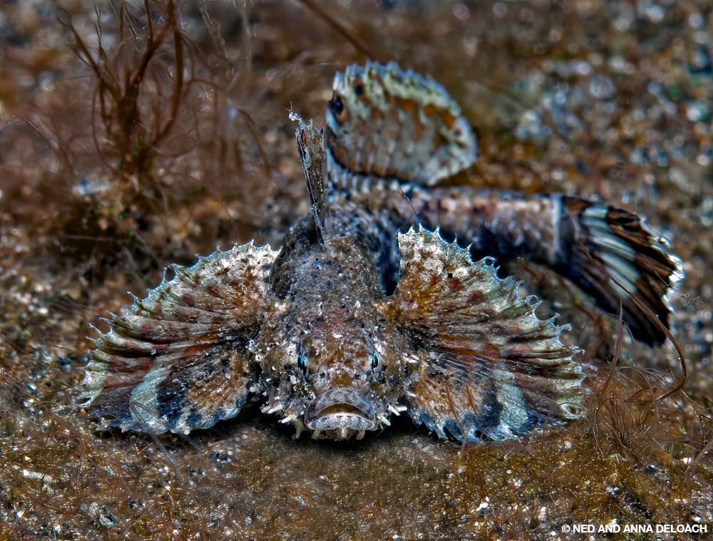 Una pequeña cantidad de esponjas y peces insulsos era todo lo que rompía la sucia monotonía. No había aparecido nada gratificante, agradable ni interesante hasta que nuestro guía encontró el primer animal de cuento de hadas del día. Había dos pejesapos rayados del tamaño de un puño enclavados dentro de una depresión de arena. Cada uno de nosotros se asombró ante una de las criaturas marinas más encantadoras que habíamos visto. Con el primer avistamiento victorioso, entramos en un modo de búsqueda de tesoros justo cuando el guía nos hizo señas con la luz de mano en la oscuridad a la distancia. Nos desplazamos como una jauría de sabuesos felices que no desearía estar en ningún otro sitio.