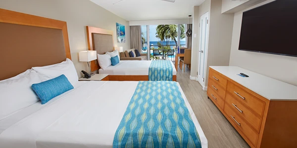 Immerse yourself in fifty shades of blue at our spectacular oceanfront resort conveniently located just minutes from the airport and a 5-minute walk to town. Our resort offers both room only and all-inclusive options. Colorful and laid-back, this water-lover’s paradise offers two sparkling pools, a day spa and fitness center, weekly activities, delicious dining, an intimate casino, and an award-winning PADI five-star dive operation with a fleet of six dive boats, private dive lockers, a dive shop with equipment rental, and a famed house reef you can explore 24/7.