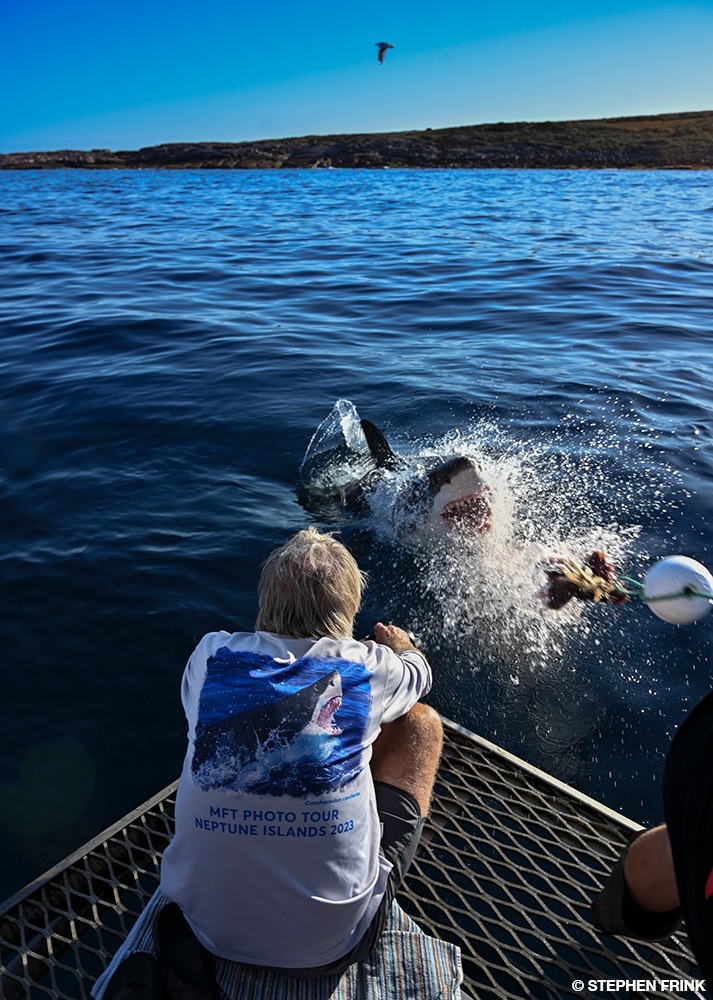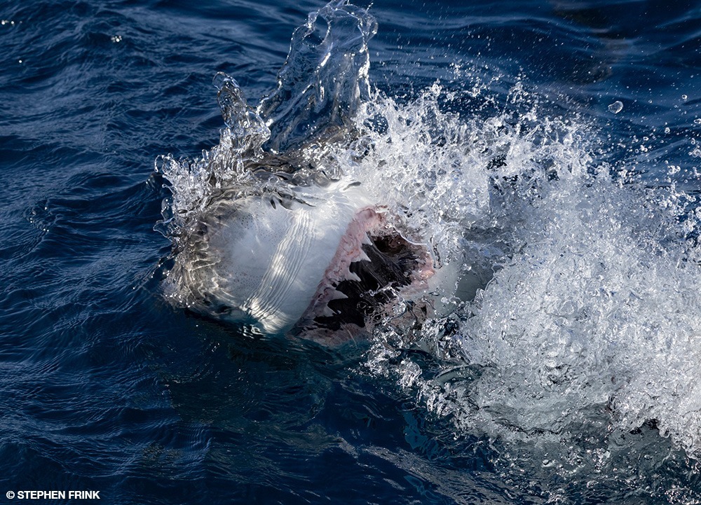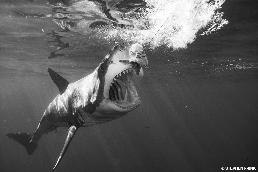Sharks have learned to associate the sound and pattern of fishing boats and now target them to take hooked fish, often hiding below in the shadow of the boat. © Stephen Frink