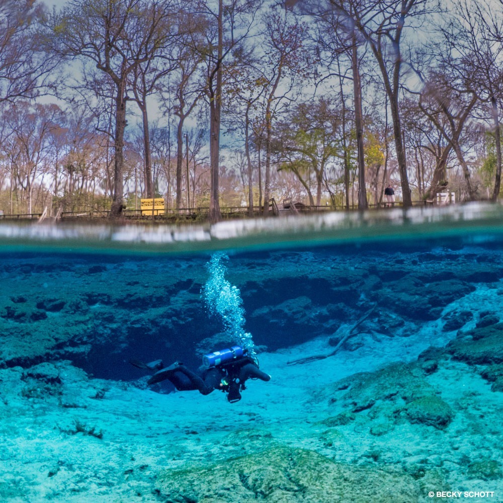 I’ve spent decades photographing springs throughout the state. My first visit was when I was 14 years old, after my family moved to Orlando. Ocean charters were out of reach, so I turned inland. The springs were inexpensive, accessible, and almost never affected by the weather. They were a controlled place for a new diver to gain more experience. These charming environments ignited in me a lifetime passion for diving into the inviting blue waters, leading to caverns and cave systems spanning miles beneath the surface.
