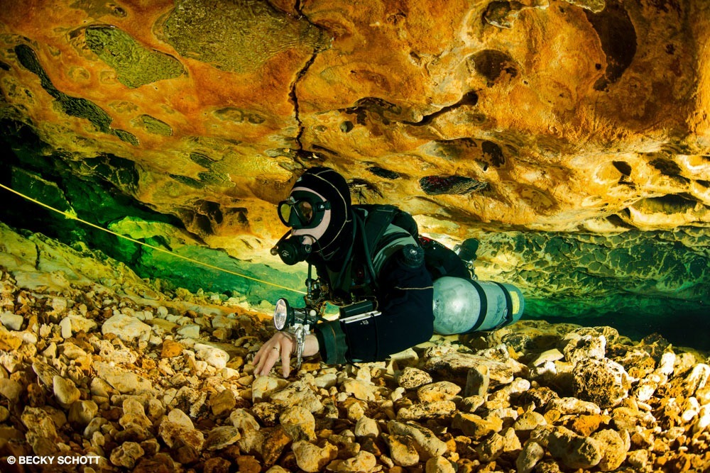Cave diver Kevin Bond investigates animal bones inside of the Peacock Springs cave system.