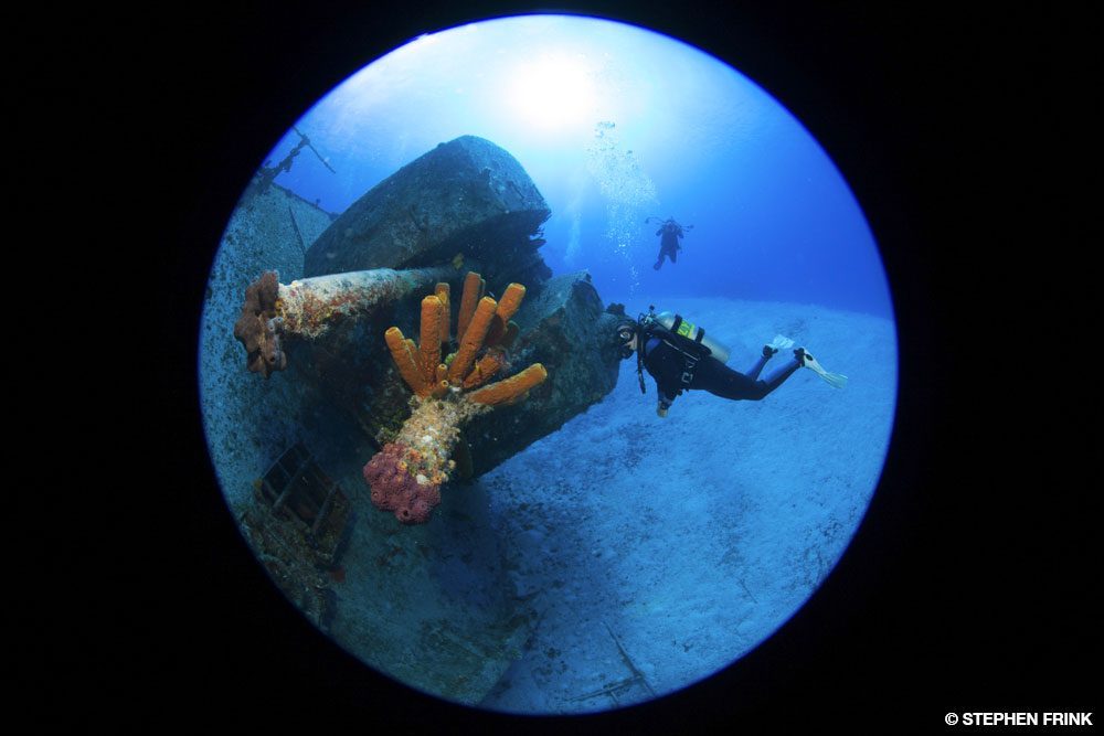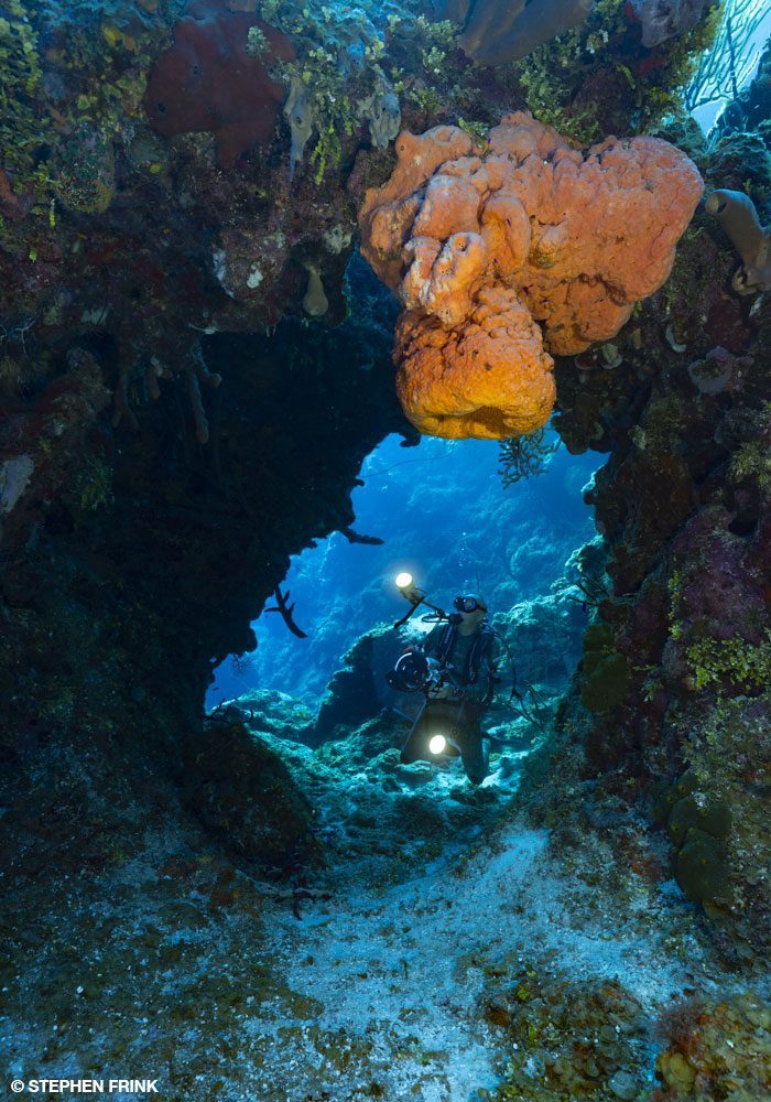 Ce site a toujours fait partie de mes favoris, et il n’est donc pas surprenant qu’il figure parmi les images retenues. Le tombant commence à seulement 18 pieds (5 mètres) — d’où son nom alternatif — et une large faille divise la paroi. Jackson Bight se trouve sur la gauche, tandis que Bloody Bay Wall s’étire sur la droite. J’y ai réalisé une silhouette de tortue contre le soleil ainsi que les classiques photos de tortue en premier plan avec un plongeur en arrière-plan. Mais, honnêtement, les tortues sont si abondantes sur Bloody Bay qu’il aurait été possible de faire ces images presque n’importe où le long du tombant. Les bancs de grognons évoluant parmi les gorgones et les éventails de mer sont aussi caractéristiques de Mixing Bowl, et la paroi reste joliment décorée.