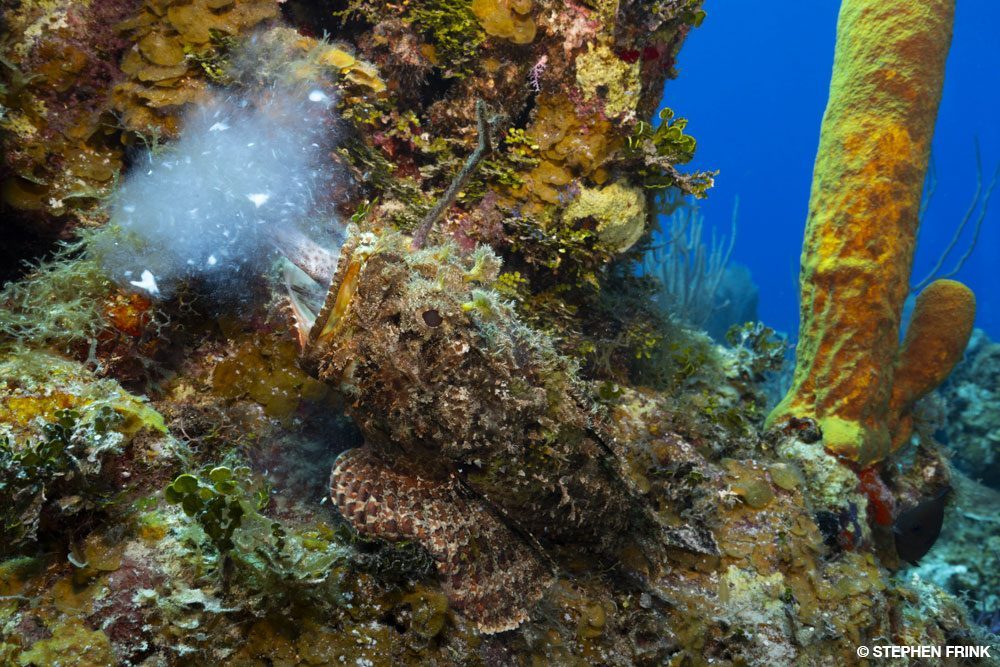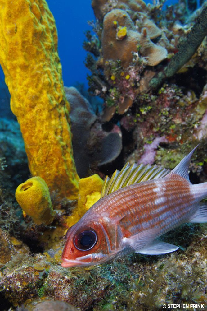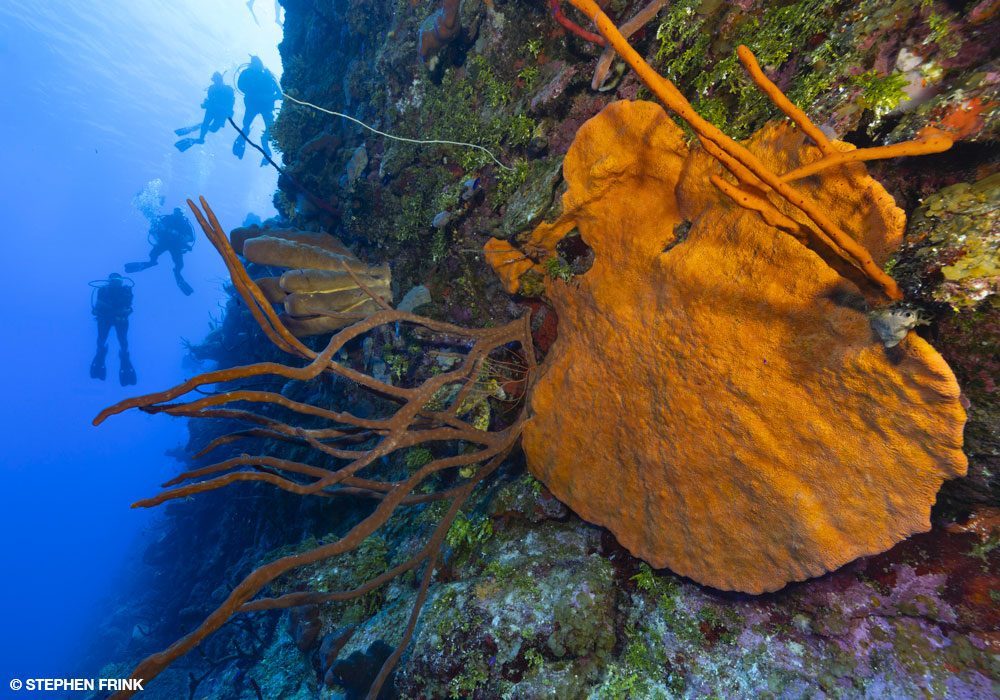 Ce tombant offre les grandes opportunités grand-angle typiques de Little Cayman. Immenses éponges “oreilles d’éléphant” orange, entourées d’éponges corde et tubulaires, le tout baigné dans une eau d’un bleu indigo profond.