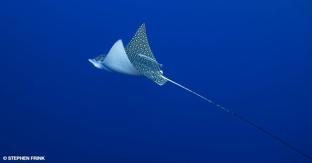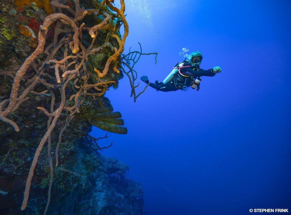 À peine entré dans l’eau, j’ai aperçu une raie aigle tachetée qui longeait le bord du tombant. Je l’ai suivie un instant vers le bleu, puis je me suis laissé glisser le long de la paroi jusqu’à environ 80 pieds (24 mètres), attendant que le reste du groupe arrive et se positionne devant les différentes formations d’éponges qui ponctuent cette verticale spectaculaire.