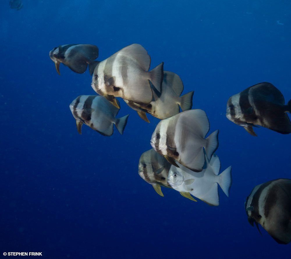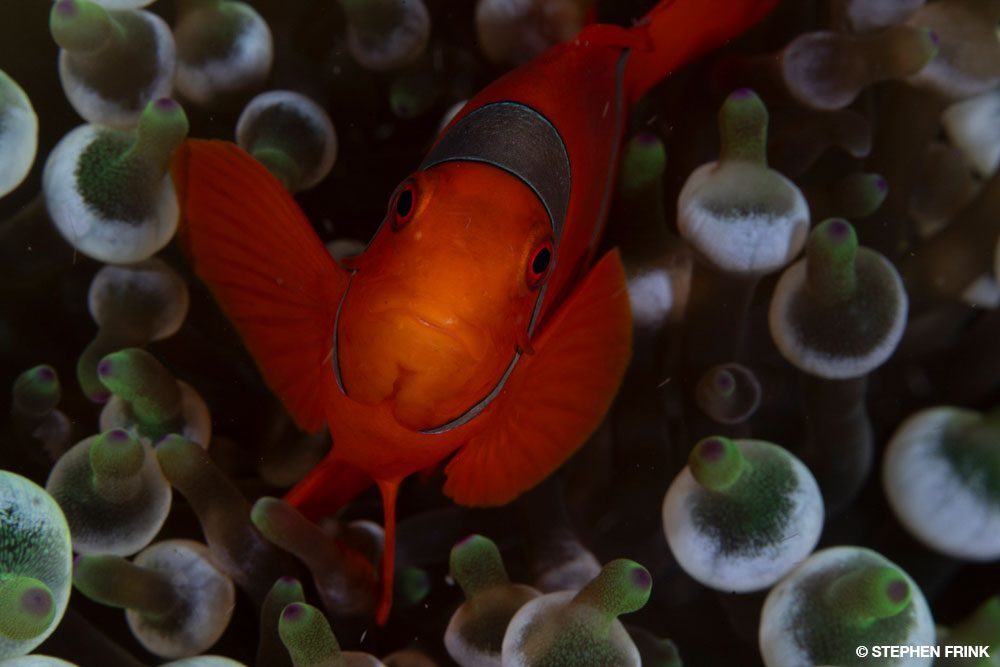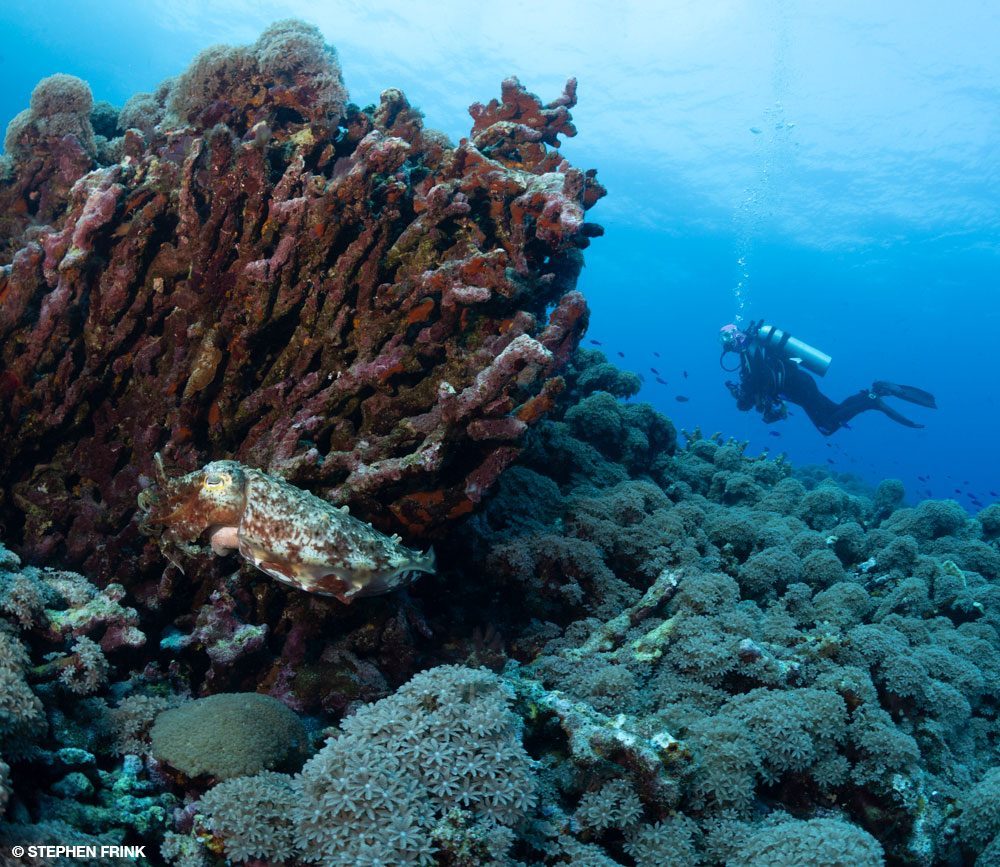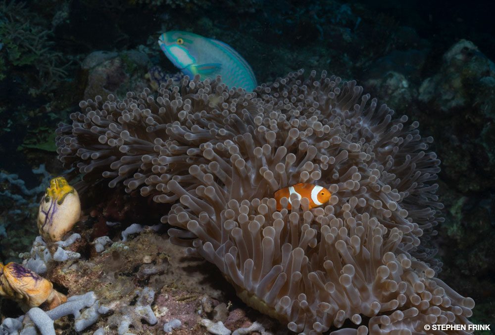 Si je devais choisir une seule plongée favorite de tout le séjour, ce serait celle du matin à Kilibob’s Knob après notre traversée nocturne vers les Fathers Reefs. Alors que je nageais de la plateforme de plongée jusqu’au mont sous-marin, un large banc de platax peu farouches m’a incité à flâner en pleine eau. Quand je me suis finalement approché du récif, un feu d’artifice de flashes a révélé un couple de seiches. Arrivant après tout le monde, j’ai attendu que mes amis terminent leurs photos avant d’approcher pour prendre quelques clichés. Les seiches ne se sont jamais éloignées de plus de quelques mètres, ce qui m’a confirmé que notre présence n’était pas trop intrusive. Au sommet de la crête, il y avait une abondance d’anémones avec différentes espèces de poissons-clowns et un grand banc de carangues.
