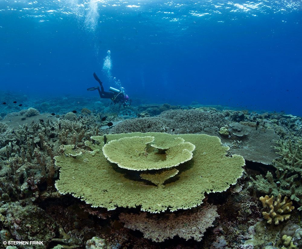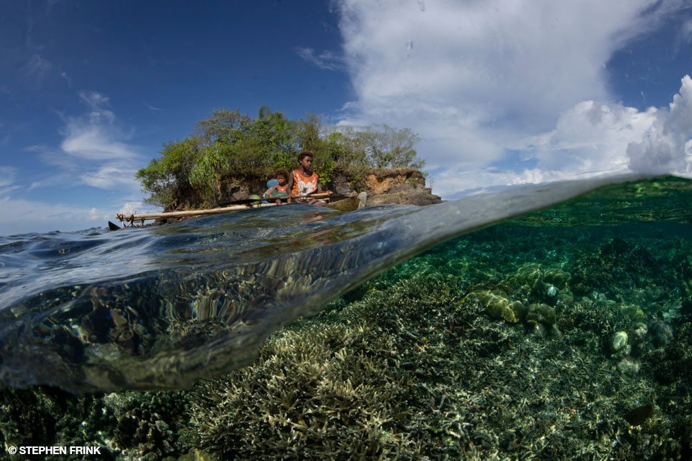 La photo en split-shot de Doubilet — un homme et un garçon dans leur pirogue avec, en dessous, des coraux laitues et cornes de cerf immaculés — a été prise à Tuare Island, où nous nous sommes rendus le deuxième matin. Cette image a été publiée dans le National Geographicpuis en couverture du numéro Hiver 2018 de Alert Diver . Impossible de passer à côté sans rendre hommage au même récif : pendant que le groupe plongeait sur le Joelle’s Reefun des guides m’a accompagné en zodiac jusqu’à l’île pour que je puisse moi aussi réaliser des split-shots.