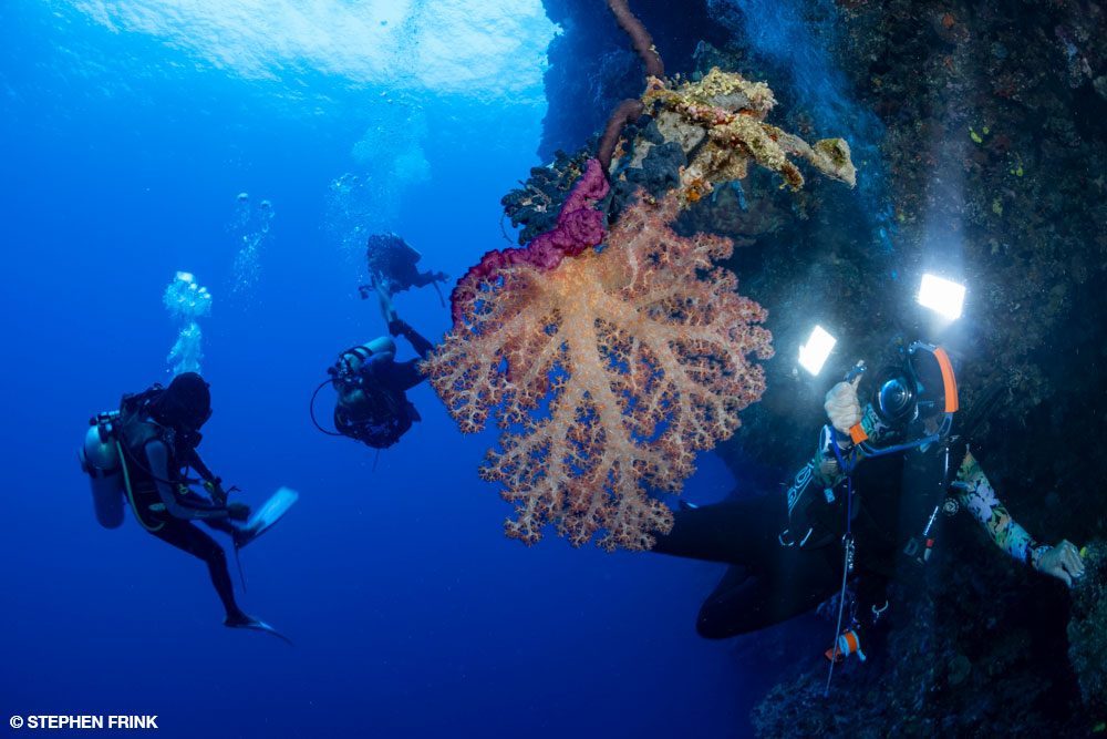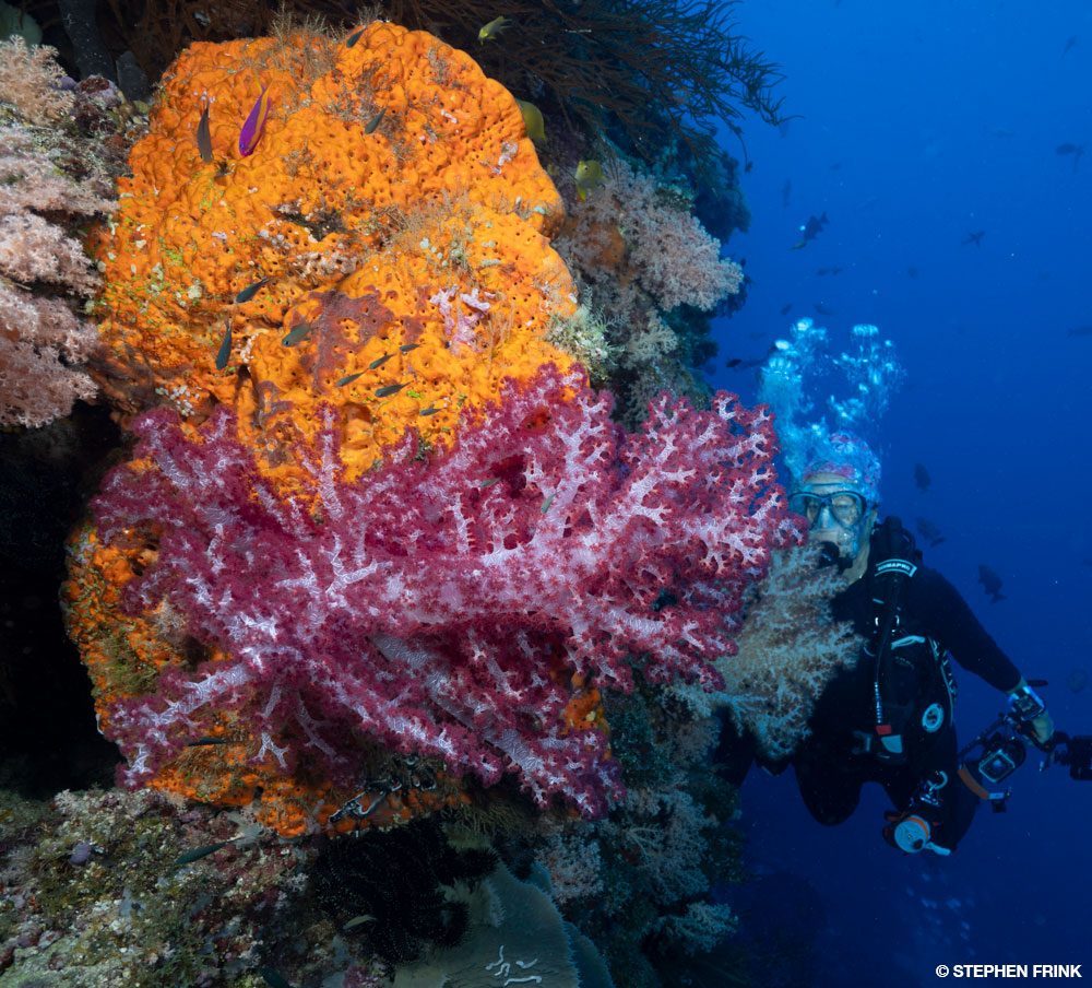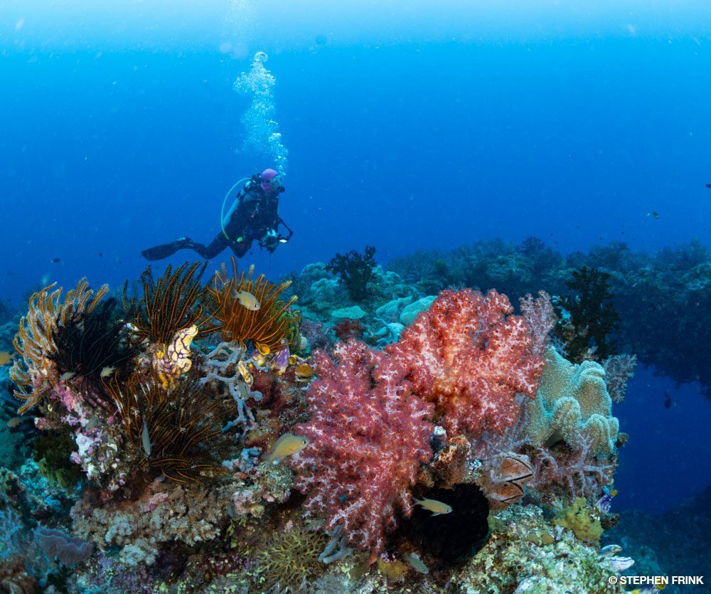 L'arche est une autre destination emblématique de plongée grand angle des Fathers Reefs, réputée pour l’abondance de bouquets de coraux mous roses et rouges qui mettent en valeur l’arche corallienne à l’arrière-plan. Le capitaine Alan Raabe du Febrina a été le premier à plonger sur bon nombre de ces sites et, même s’ils sont désormais équipés de bouées de mouillage et familiers après des décennies de croisières-plongée, j’imagine à quel point cela devait être excitant d’être parmi les premiers à découvrir un site comme celui-ci ou Jayne’s Gully.