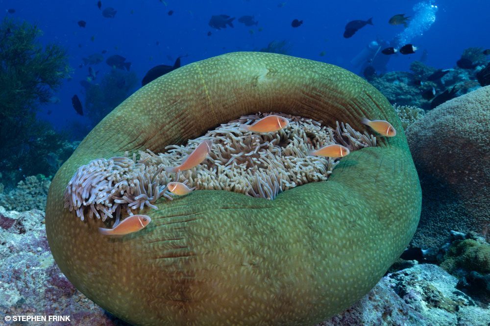 Au fil de la semaine, j’ai découvert que ce spectacle d’anémones en boule était en fait fréquent sur de nombreux récifs. Peut-être était-ce lié au moment de la journée, du mois ou de l’année, mais à force, c’en était presque devenu banal de les croiser le long du récif. Des bancs de platax et des tortues accompagnaient les coraux laitues immaculés qui ornaient la pente du récif.