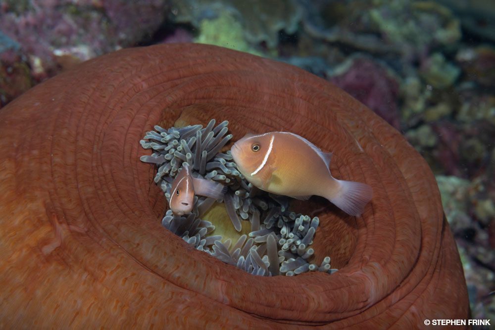 Ne voulant pas manquer Joelle’s, un site souvent cité comme l’une des meilleures plongées de la baie de Kimbe, j’ai participé à la deuxième plongée de la journée. J’ai eu la chance de tomber juste sous le bateau sur une anémone en boule particulièrement photogénique, dont le manteau lavande tranchait joliment avec le poisson-clown résident.