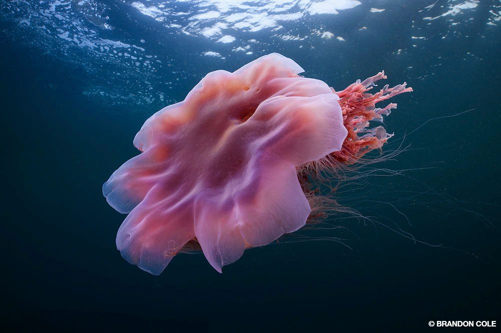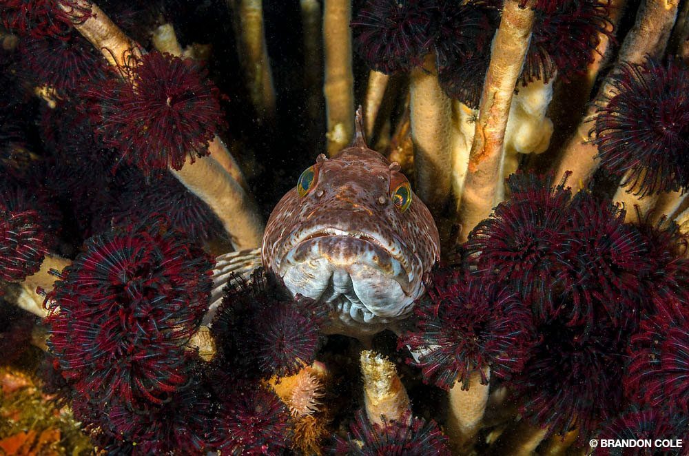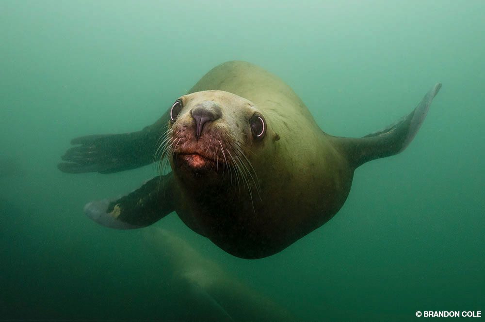 La présence de dizaines d’ophiures-panier à Blowhole (aussi appelé Marge’s Wall) prouve que ces échinodermes aux bras arachnéens apprécient ce récif — tout comme moi. Une vingtaine de sébastes noirs m’observaient pendant que j’essayais d’alterner entre prendre en photo les ophiures immobiles, aux bras élégamment déployés, une méduse crinière de lion qui passait nonchalamment, et quelques otaries de Steller qui surgissaient sans bruit derrière moi avant de disparaître aussitôt que je me retournais. Je n’ai jamais été très doué pour le multitâche.