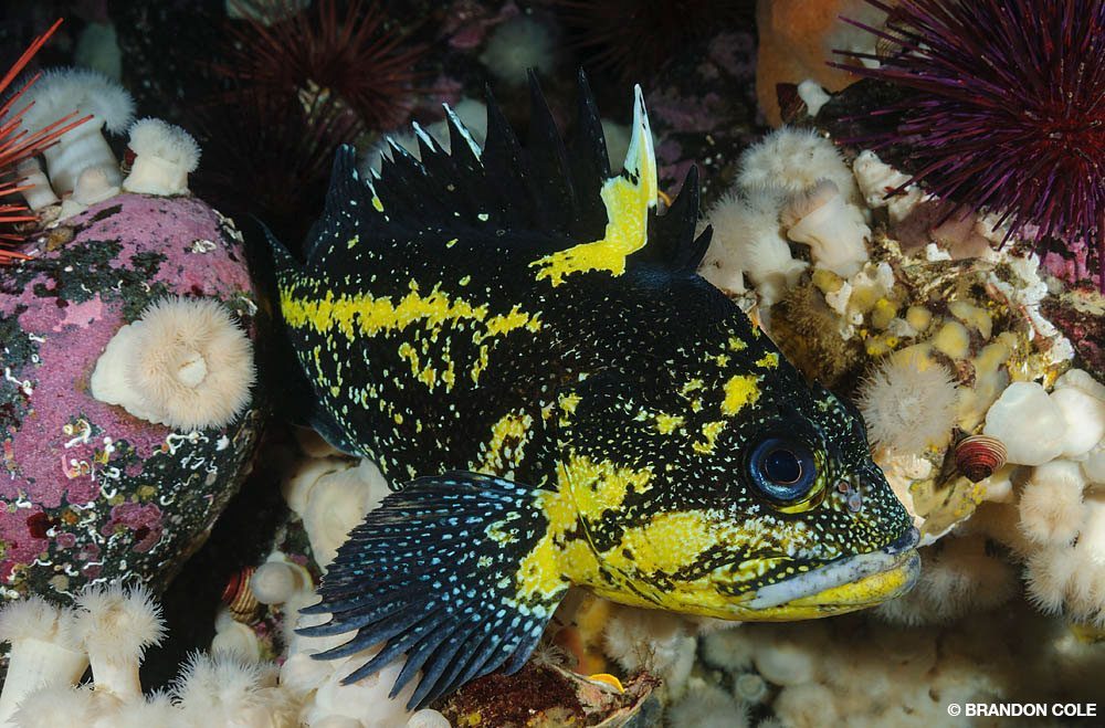 Un chabot à tête écailleuse (Artedius harringtoni) passe près d’une colonie d’anémones de mer.