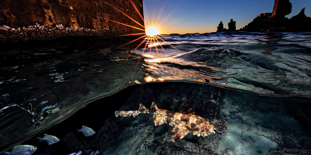 One wobbegong unexpectedly emerged from a wreck while I was photographing fish and birds at sunset. Fortunately, I was already set up to shoot this scene and was able to capture the shark swimming by.