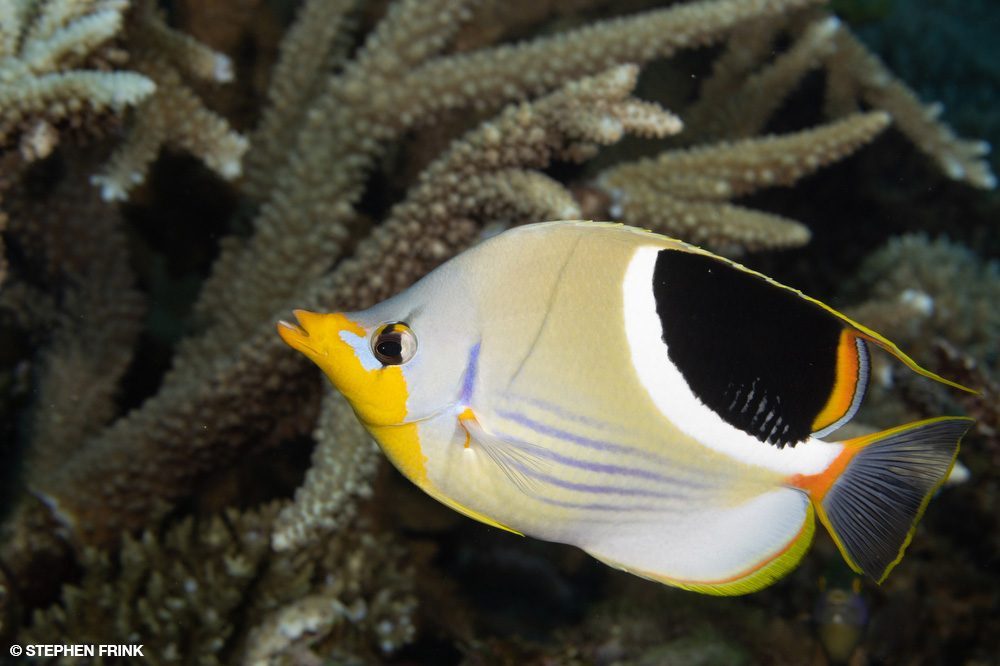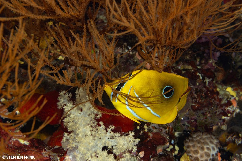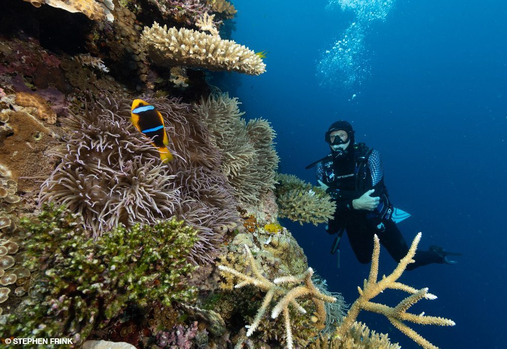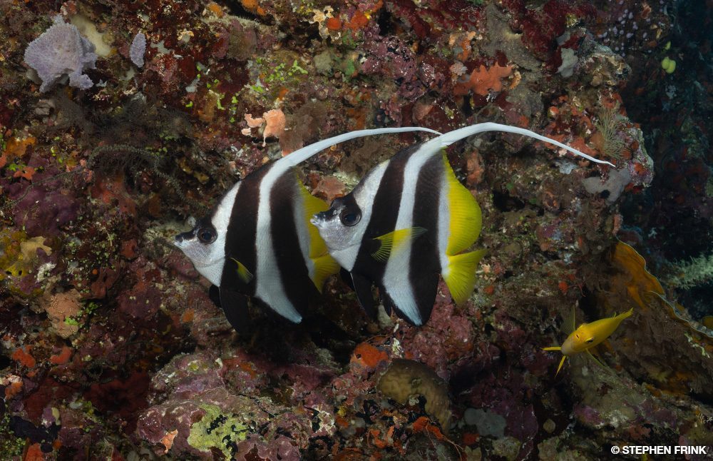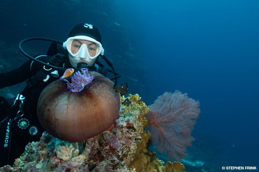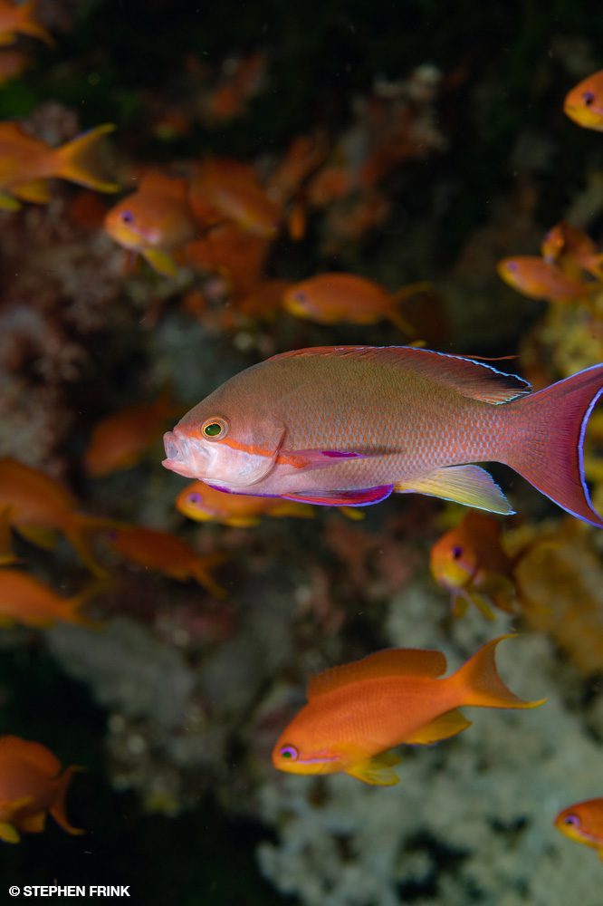 We next headed to Mellow Yellow, named for the concentration of yellow soft corals growing on the current side of the reef pinnacle. The top of the pinnacle was my favorite. We barely dipped below 40 feet (12 meters) as there was so much action in the shallows. Pink and purple anthias clouded the top reef and squeezed into every gap. There was every kind of coral: leather corals, hard and soft corals, and even large purple anemones hosting orangefin anemonefish. The level of reef biodiversity was unbelievable.