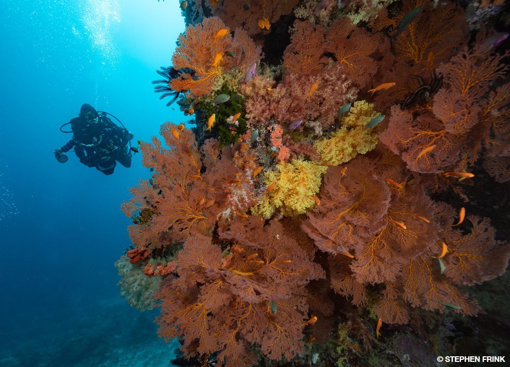 Nicole and I descended and started to circle the large, sloping pinnacle. Reef fish, gorgonians, and soft corals surrounded us, so there was no shortage of photographic subjects here. Nicole posed next to a giant crimson sea fan that stuck out of the reef like a huge flame. I was glad to have her there to show the sheer size of this specimen. After what felt like a quick 50 minutes, we surfaced and climbed back aboard.