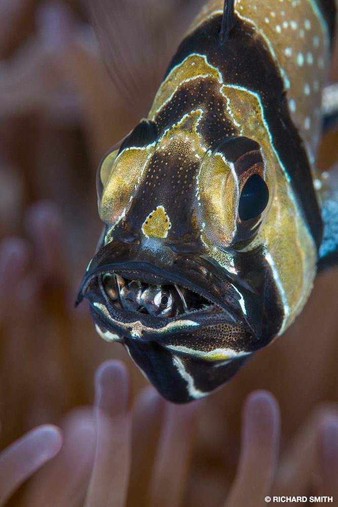 Magenta dottyback with pair of isopod parasites (Halmahera, Indonesia): Parasites and their biology fascinate me. It blows my mind that each species on Earth is believed to have its own unique parasites. I have found many parasites that are completely new to science, but requests from researchers for me to collect them and the fish they are attached to haven’t been helpful, especially when the parasite is living in the nostrils of a 2-foot-long crocodilefish. I have only seen magenta dottybacks with these isopods in Halmahera, Indonesia, where probably one-third of the dottybacks had these nefarious hitchhikers. Parasites such as these are unlikely to kill their host but are fueled by feeding on the hapless fish’s blood.