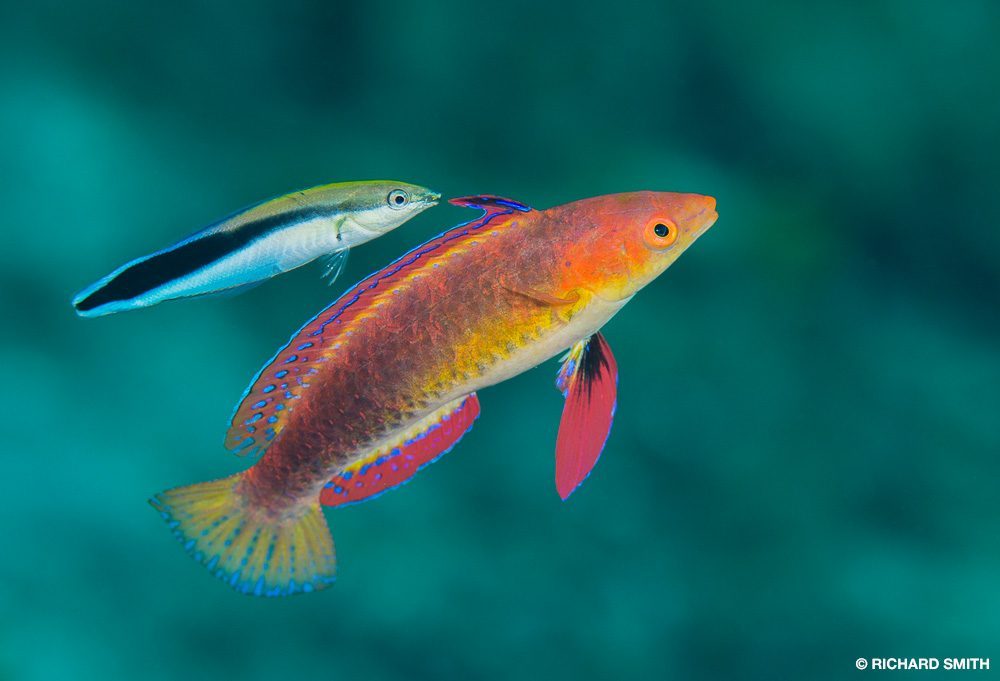 I was diving in a remote corner of eastern Indonesia with my longtime friend and guide, Yann Alfian, and the incredible naturalists and conservationists Ned and Anna DeLoach. We moved quickly along the gentle slope until Anna headed for a bommie just off the main reef. Very short, branching corals covered the saddle. Anna suddenly started pointing excitedly at a few flashers that were displaying above the corals. We could immediately see they were different from anything we had seen before. The brightly colored males stood out, with scarlet rounded fins and yellow, blue, and golden streaks throughout their bodies. We all watched in awe before getting down to the important work of capturing an image. A year or so later, per Anna’s request to ichthyologist Gerry Allen, the new species was named Alfian’s flasher wrasse.