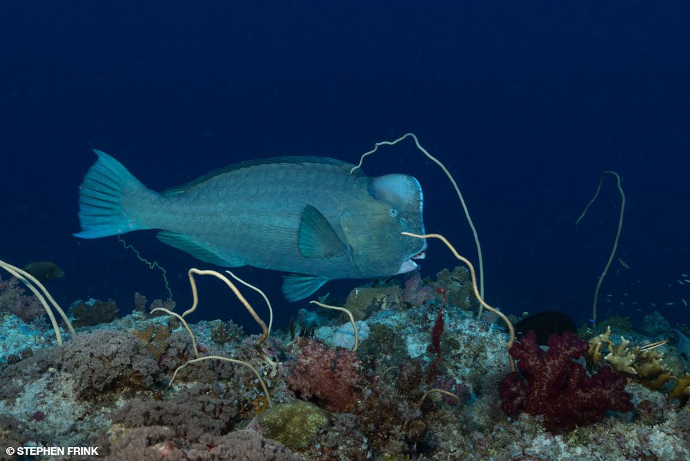 A large bumphead parrotfish grazes among the reef rubble at Blue Corner, while divers use reef hooks to hold their position in the current. © STEPHEN FRINK