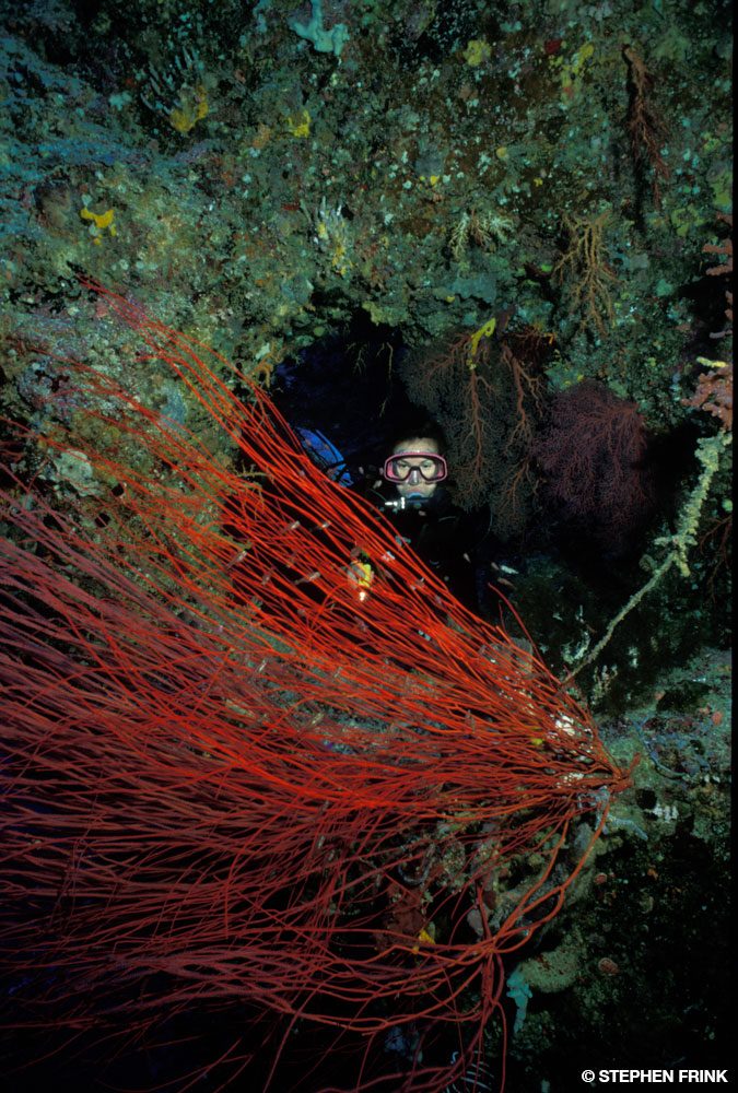 Underwater photographer Paula Selby cruises New Drop-Off, enjoying the wide-angle vistas. © STEPHEN FRINK