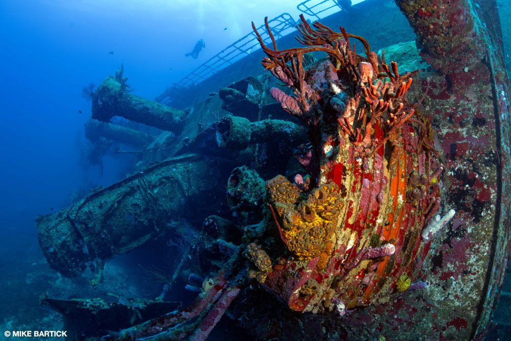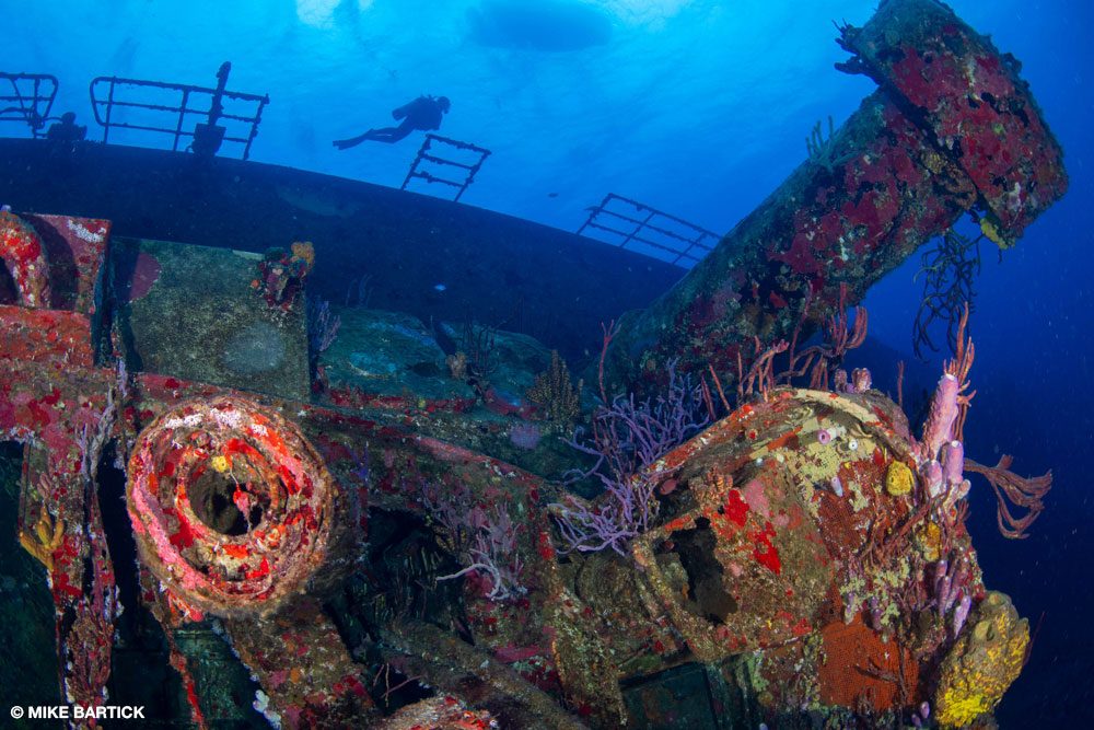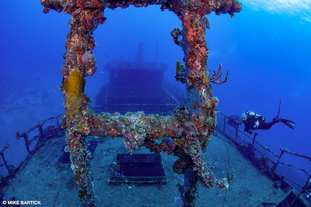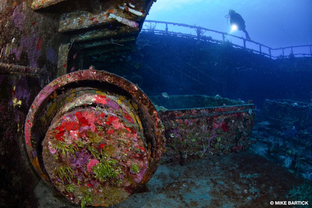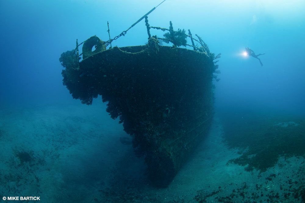 The debris field near the bow’s mooring line immediately grabbed my attention. The disjointed crane assembly used to deploy cable rests upside down in the sand with its beams reaching upward and the cable reel still intact on the ship above. From the forward debris field you can see the upper deck and superstructure, open hatches, walkways, and part of the winch towers, which are now deformed and bending downward. The wreck is brimming with fascinating finds all along the 30-foot (9 meters) mini wall that the deck has become.