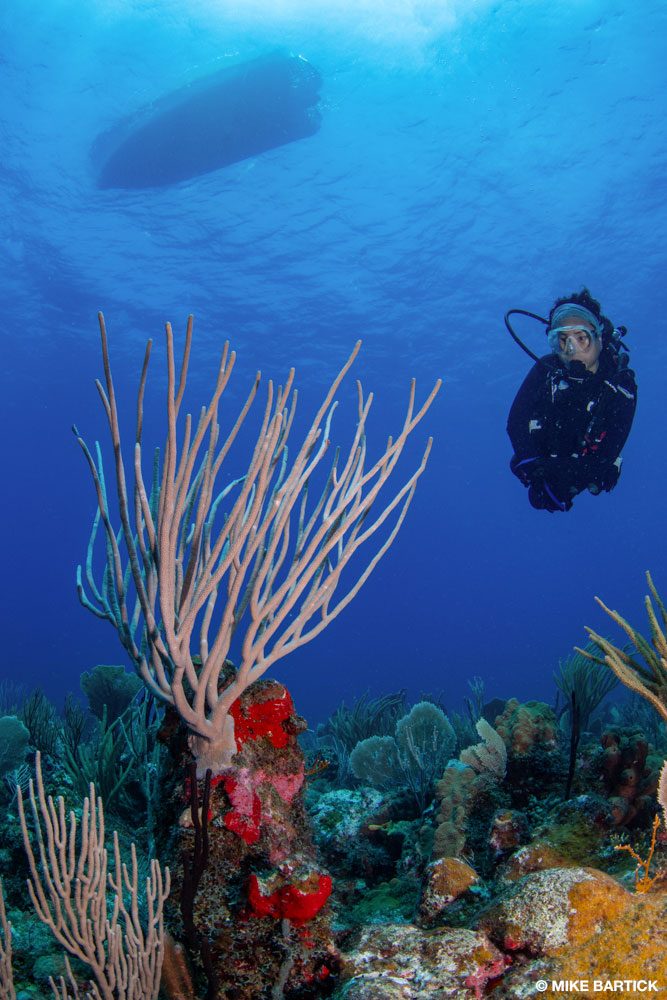 During our first dive at Anchor Point, I realized that rolling into history wasn’t just a metaphor, as artifacts dating to the era of my research came into plain view on the substrate below. As we explored, my mind drifted, admiring the past alongside the present. The seabed here is variegated. Reefs push up like a network of small cays surrounded by sand and seagrass. Healthy sea fans, sea plumes, gorgonians, sea rods, and other soft corals top the reefs along with barrel sponges, all thriving in the gentle prevailing current. Many reef systems here are reminiscent of overturned vessels, with a heavy sprinkling of sponges and other colorful growth and lobsters tucked into nearly every crevice.