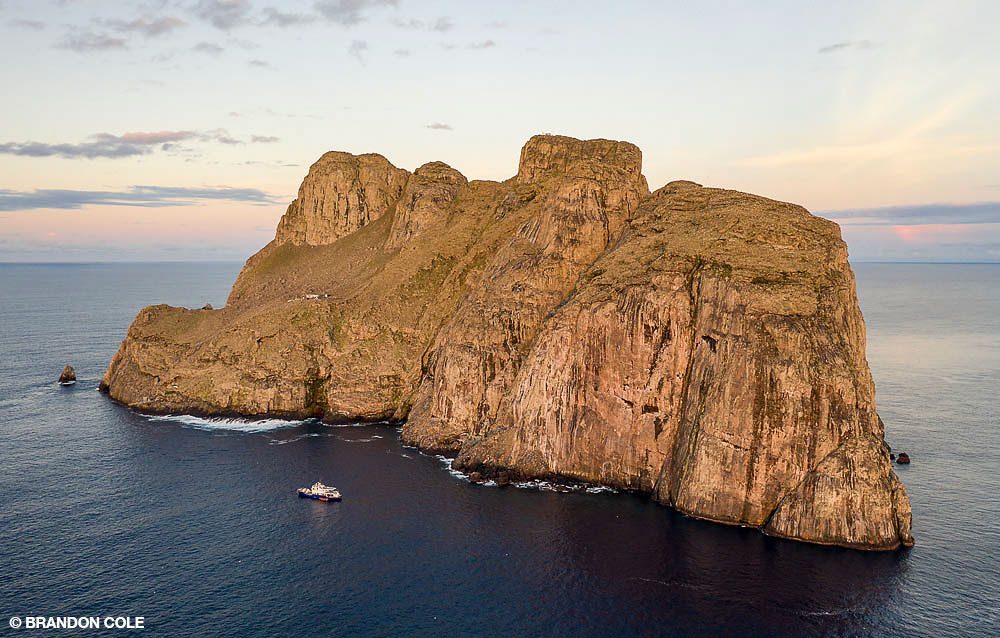 Alone in the blue about 310 miles (500 kilometers) west of Colombia’s coast, Isla Malpelo is the tip-top of a submerged mountainous ridge. Its highest domed peak soars 980 feet (299 meters) above sea level, and the island is about 1 mile long at the waterline. These stats are impressive when bobbing in an inflatable boat next to the volcanic monolith and craning your neck skyward. The above-water portion, however, is insignificant compared with the monumental scale of its basalt foundation, which stretches 190 miles (306 kilometers) long and is rooted in the abyss more than 13,000 feet (4,000 meters) below.