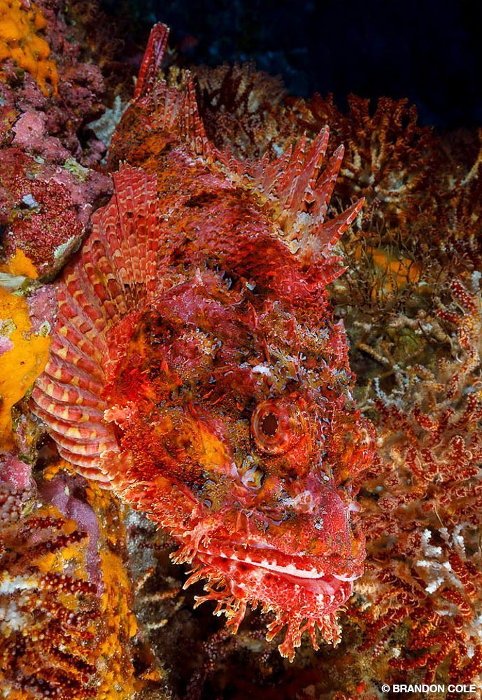 We made the most of the conditions and leaped at the chance to visit La Ferreteria. This spectacular pinnacle’s highest point is 57 feet below the surface. Fat and happy scorpionfish were abundant on this sheer-sided spire. Some were well camouflaged, blending into a living tapestry of small gorgonians. We could easily spot those that contrasted with the background reef. Moray eels were everywhere, sometimes packed side by side in a crevice like a tangle of evil-looking sock puppets bursting out of a messy drawer. At other times they freely swim over the colorful seascape.