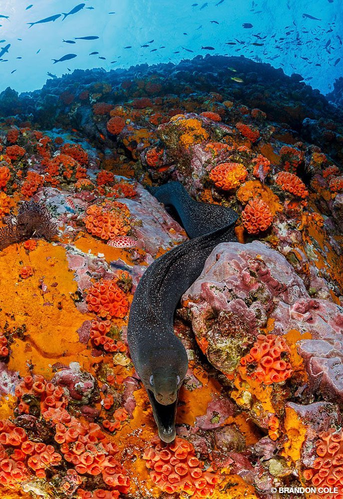 Eels, scorpionfish, and many other reef fish and invertebrates spend their entire adult lives around Malpelo. Some of the wildlife are itinerant visitors.