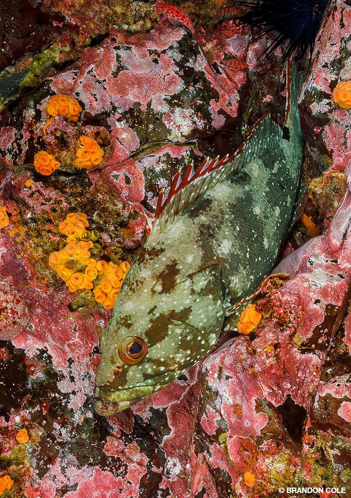 Thanks to prolific invertebrate growth, rock surfaces were much more colorful than we expected. There were orange cup corals, pink coralline algae, bright sponges, sea stars, and urchins. I spied spiny lobsters, giant hawkfish tattooed like a topographic map, Moorish idols, snappers, a few sharks, and more than a few moray eels. There were quality critters and solid photo opportunities, but they all took a back seat to the jaw-dropping aggregation of bigeye jacks. Imagine Disney World’s iconic Epcot geosphere orbiting you and flashing in the sun. Fascination pulled me to its core. The biomass’s size rivaled Baja’s storied school of jacks at Cabo Pulmo. For the last half hour, we swam alongside, overtop, underneath, and through the vortex of bigeyes.