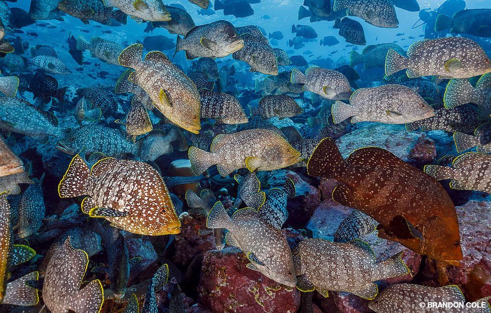 For once I was thrilled to be boxed in and going nowhere. Only when a Galápagos shark cut into the congested mass to scatter the sashimi did my view clear, revealing more than 100 leather bass swarming about, jostling with writhing moray eels in a race to rustle up a breakfast of little fish hidden among the boulders.
