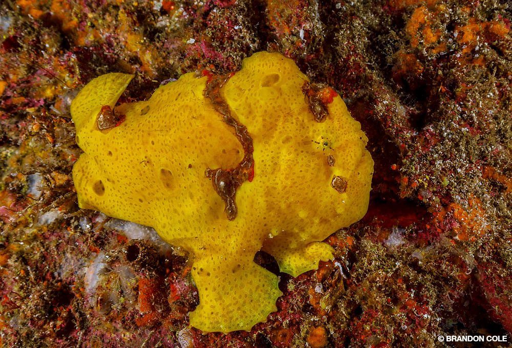 Calm seas invited us into lofty Puerta del Cielo, where we mingled with a school of snappers relaxing in the shadows of a dramatic A-frame passageway decorated with sponges and sea fans. A fist-sized yellow frogfish gripped the wall outside the gate, patiently waiting for an unsuspecting meal to swim by. It tolerated my slow and steady approach to the point that it almost touched my dome port. This dive site and a handful of other spots featuring caverns, tunnels, and other constricted spaces are sometimes off-limits because of dangerous waves.