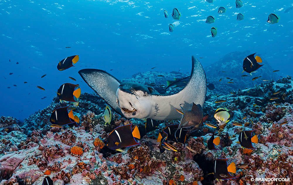 The dive was far from a bust, however, as we witnessed lots of captivating fish behavior in the shallows. Almaco jacks hunted creolefish, an eagle ray chowed down on a thorny oyster, and king angelfish and barberfish busily performed cleaning duties, removing parasites and bits of dead skin from groupers and leather bass. It’s a win-win symbiotic service. I will return to Malpelo in winter to descend into darkness and shiver as I search for the elusive shark.