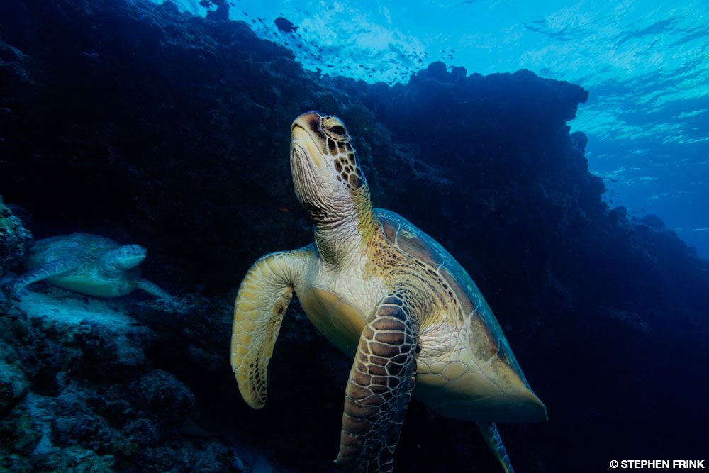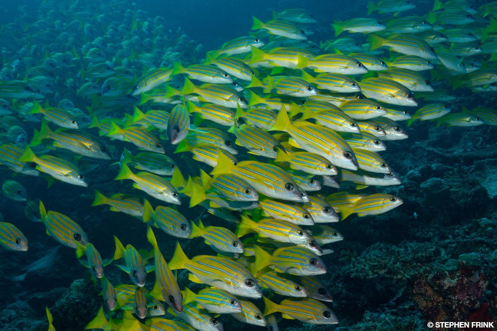 The morning dive continued our southward trajectory to Fish Head, a dive site on Mushimasmigili Thila. It was more like Fish Soup due to a light-obliterating school of Moorish idol on the island’s current-facing point. I also had great encounters with a docile hawksbill turtle and a large school of blue-lined snapper. That’s a dive I would have revisited, but it was good because of the incoming tide, and the energy would have abated at slack tide. Better to leave that one in the memory bank and on the memory cards and move on to the next adventure, another manta ray cleaning station at Mahibadhoo Rocks.