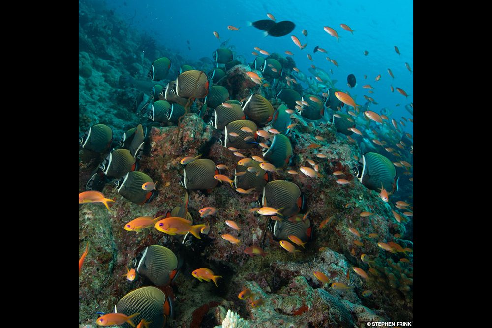 Departing Malé boats can cruise a circular route either clockwise or counterclockwise. We opted for counterclockwise to stay within reach of the airport and began with Rasdhoo Madivaru. Our checkout dive helped us dial in our buoyancy and refresh dive skills grown rusty during travel restrictions. Not expecting too much, I jumped in with a 50 mm macro lens, thinking that the water clarity would be marginal, but at least there would be good fish. The fish did not disappoint, and the visibility surprised me. We had at least 80-foot clarity and 84°F water, so it was very comfortable with my 3 mm suit. I almost immediately found a large school of blue-lined snapper and one of my favorite Indo-Pacific reef dwellers, the clown triggerfish. Coral groupers and longsnout butterflyfish decorated the sloping reef, while host anemones and their resident clownfish provided willing subjects to hone our group’s somewhat neglected photo skills.