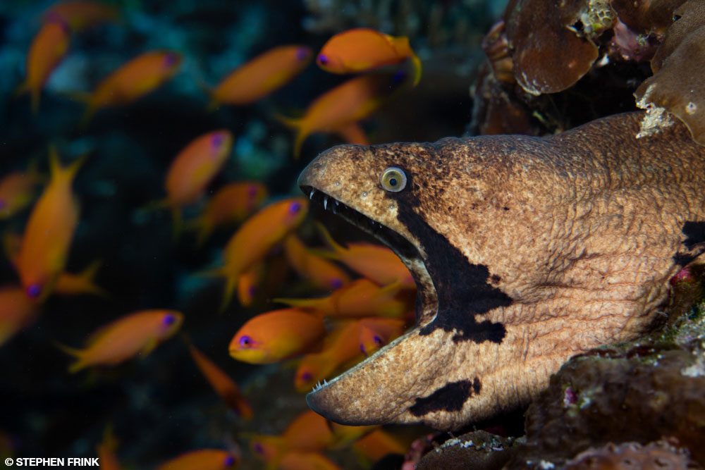 At the dive site known as Fish Tank it is common to see moray eels of different species cohabitate in the same crevices in the reef.